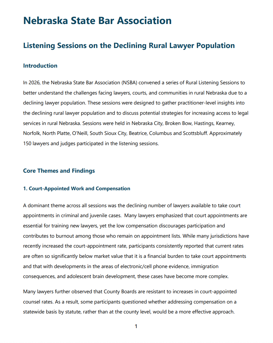 In 2026, the Nebraska State Bar Association (NSBA) convened a series of Rural Listening Sessions to better understand the challenges facing lawyers, courts, and communities in rural Nebraska due to a declining lawyer population. These sessions were designed to gather practitioner‑level insights into the declining rural lawyer population and to discuss potential strategies for increasing access to legal services in rural Nebraska. Sessions were held in Nebraska City, Broken Bow, Hastings, Kearney, Norfolk, North Platte, O’Neill, South Sioux City, Beatrice, Columbus and Scottsbluff. Approximately 150 lawyers and judges participated in the listening sessions. This report summarizes the feedback that was provided and the NSBA's recommendations on addressing the challenges created by the declining rural lawyer population.